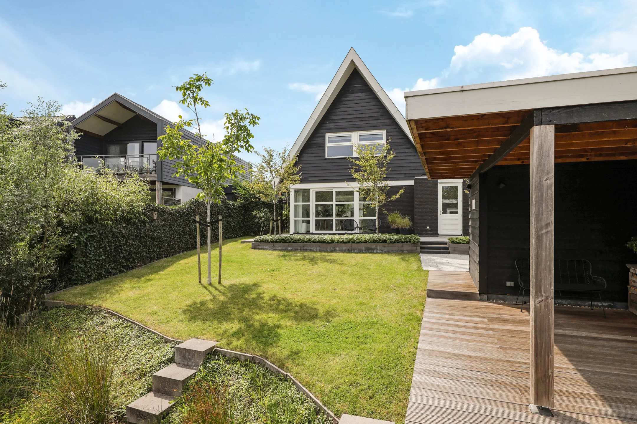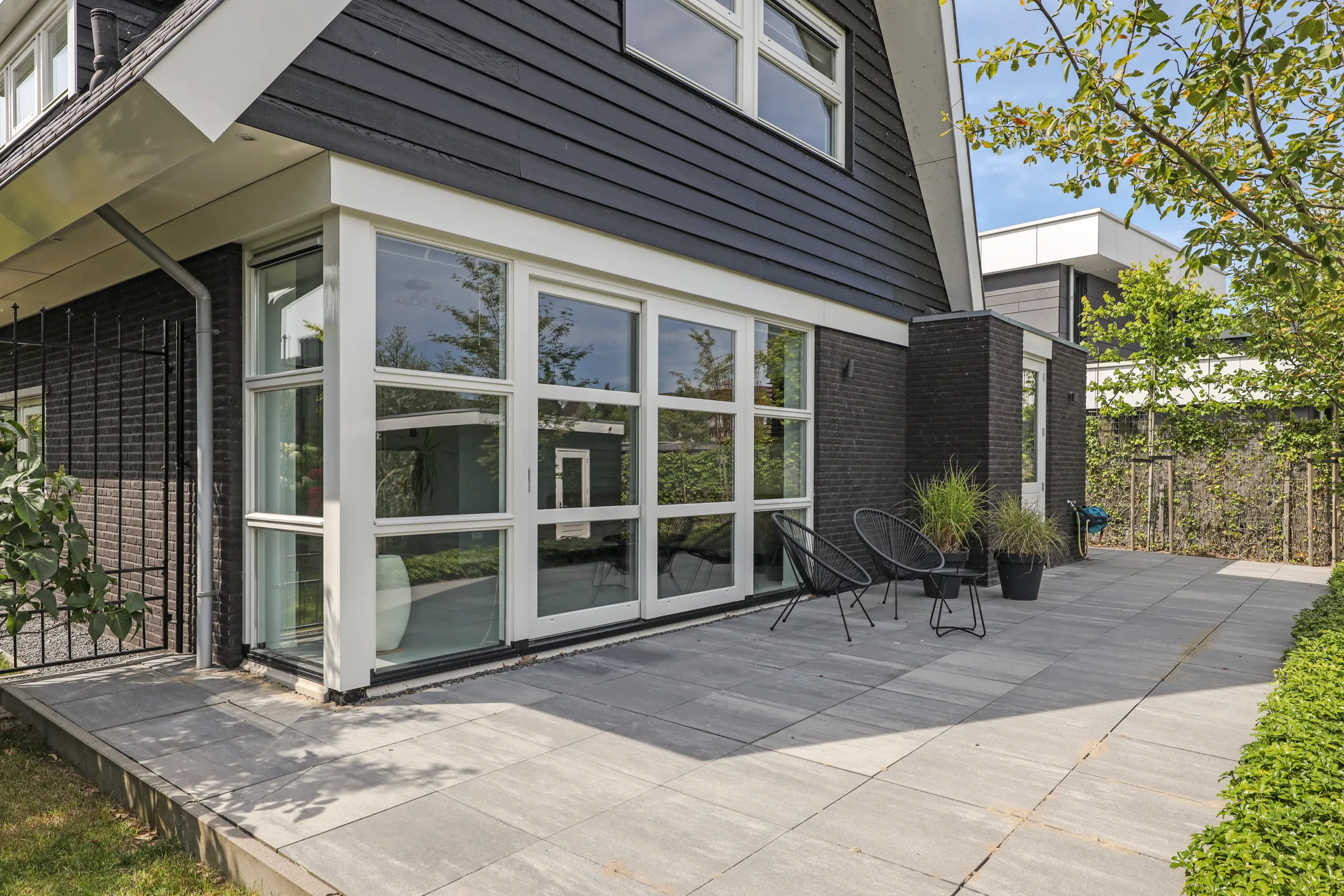 Two trees were relocated further from the extension; additionally, 6 m² of soil was replenished to create a stable root zone and a seamless ground level. The terrace was then renewed: