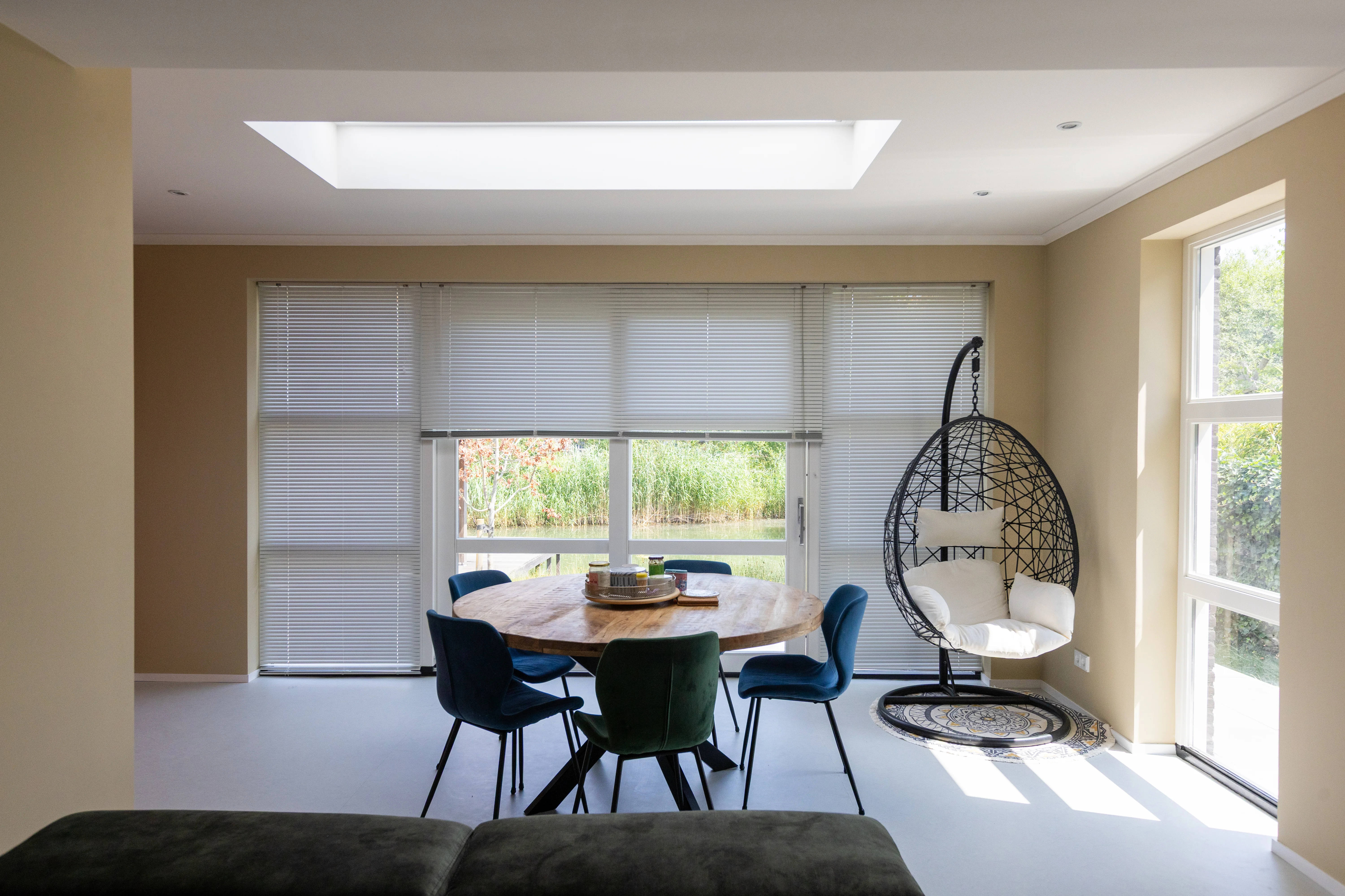 A flat roof with insulation (19.0 m²) was constructed, including roof drainage and rainwater discharge. A large fixed roof window (2500 × 1000 mm, triple glazing) with an electrically operated blind brings daylight deep into the space, enhancing light quality throughout the year.