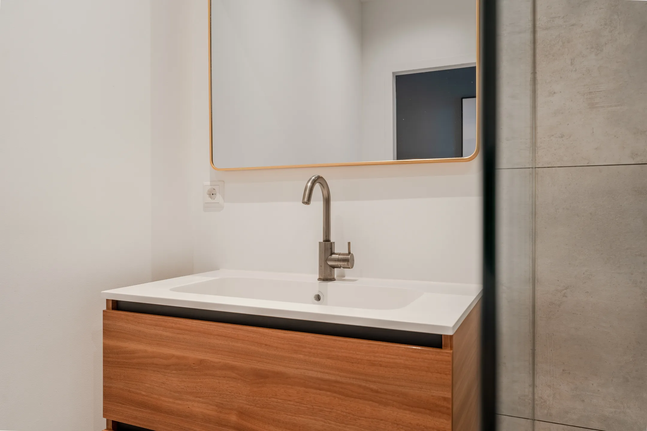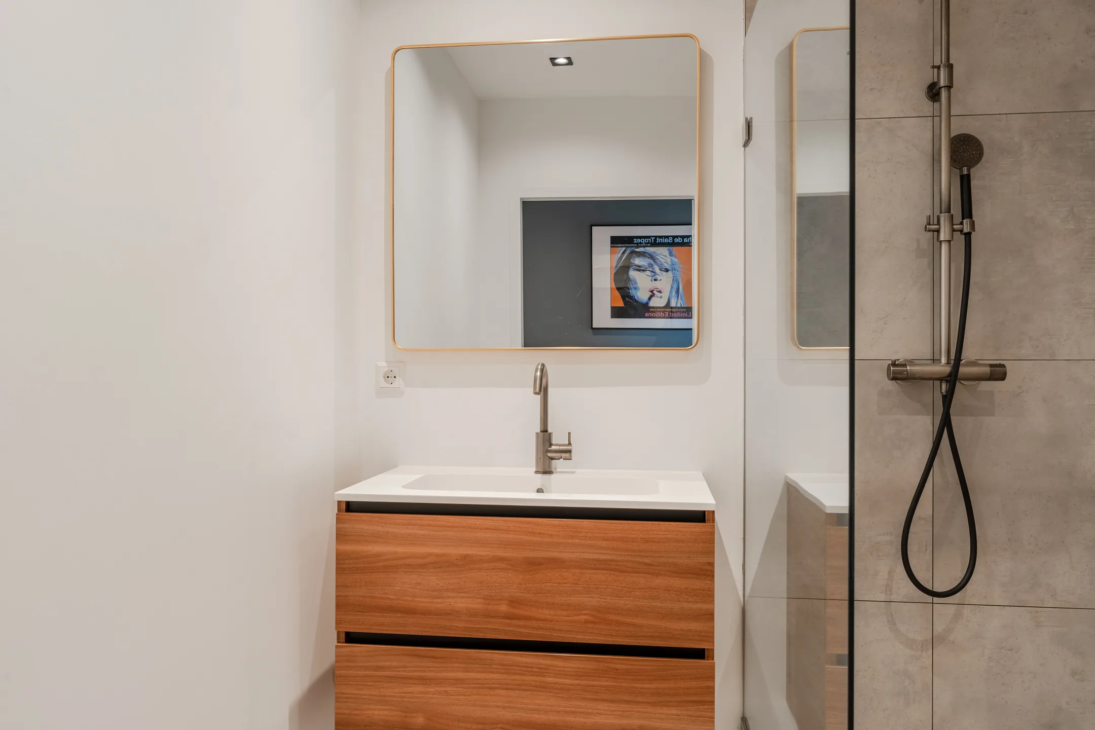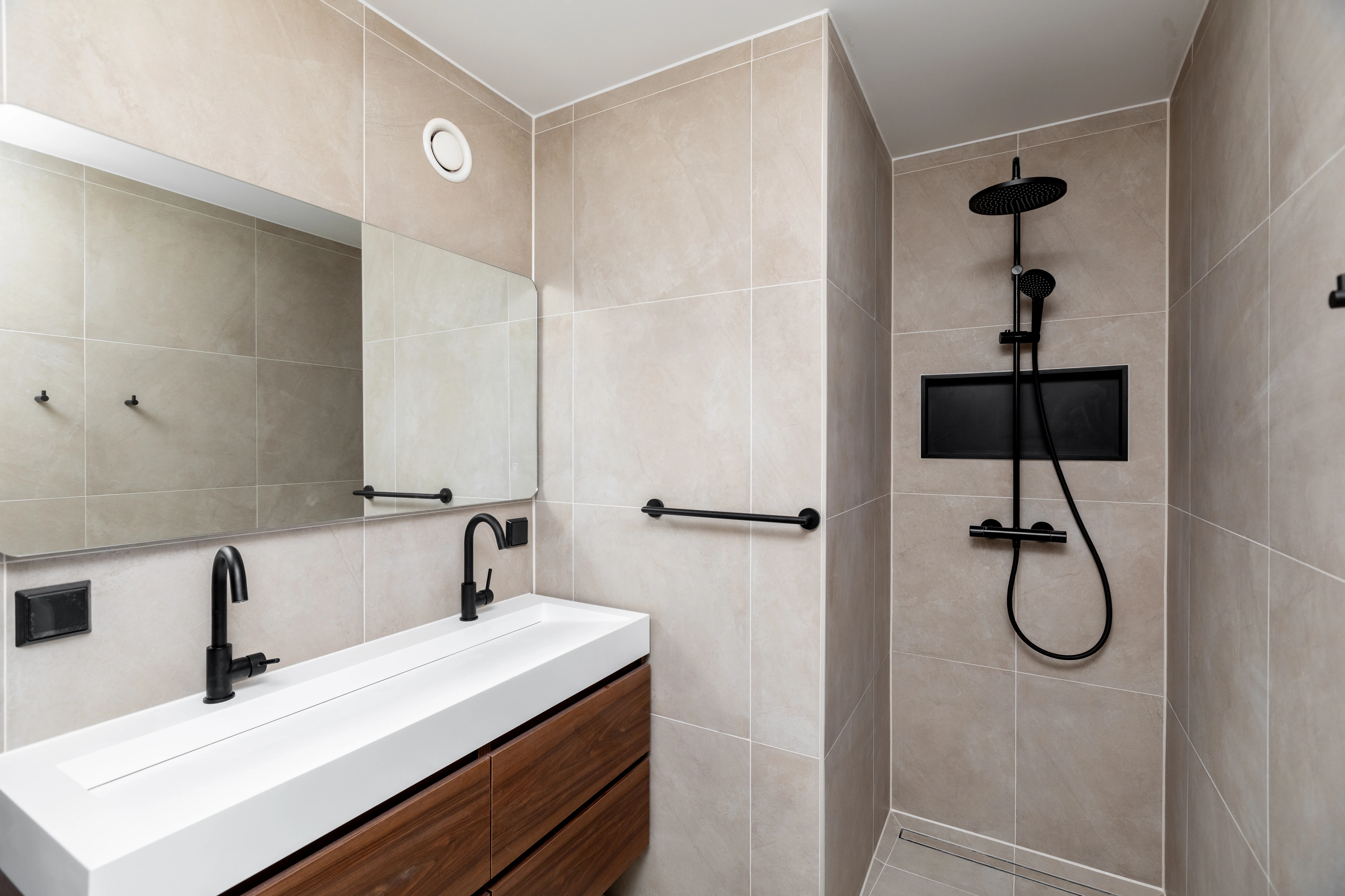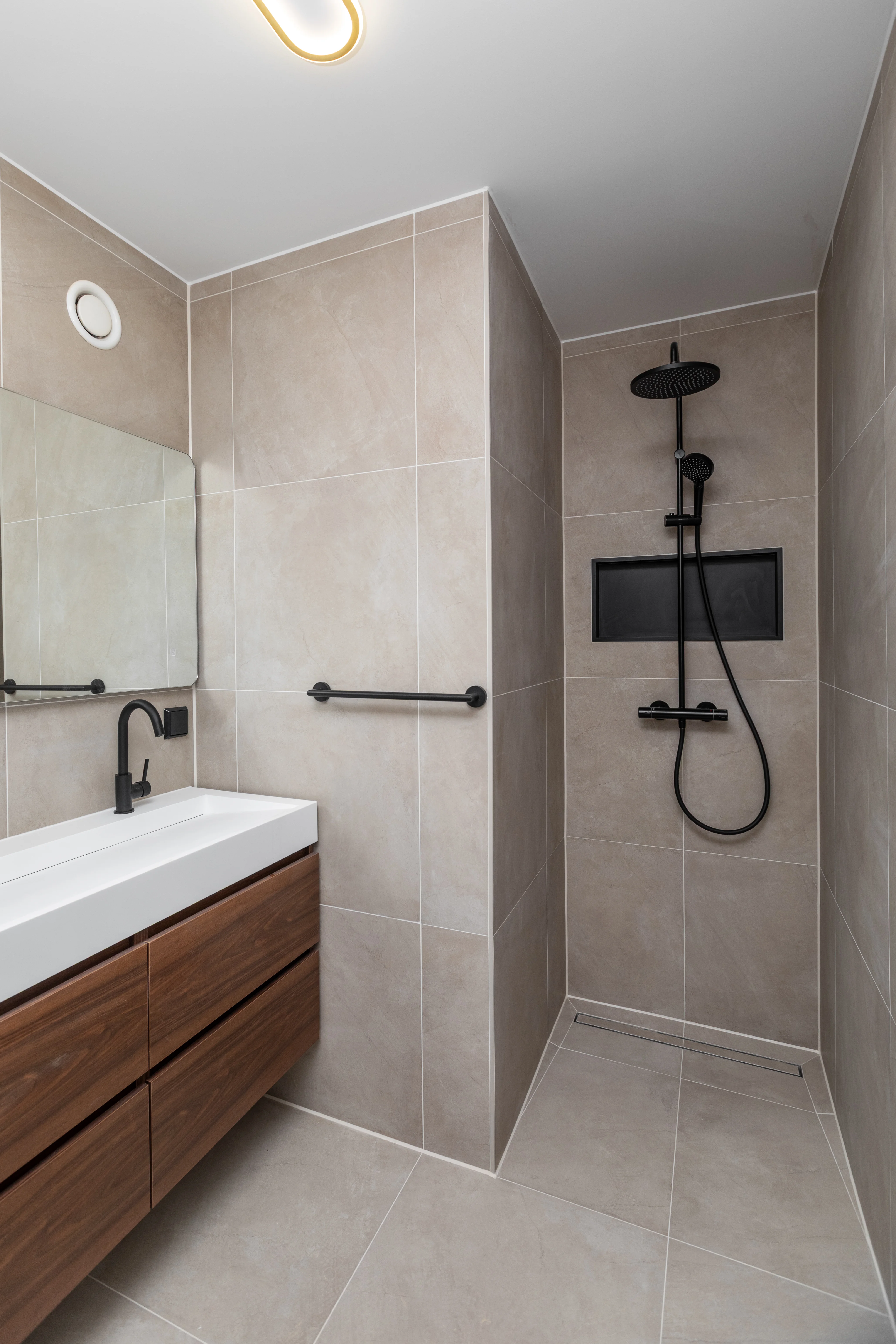 In this Amsterdam apartment, we transformed the bathroom into a calm, functional space with a spacious rain shower and a 120 cm double washbasin. A waterproof structure, precise tiling, and softened acoustics make daily use comfortable and low-maintenance.