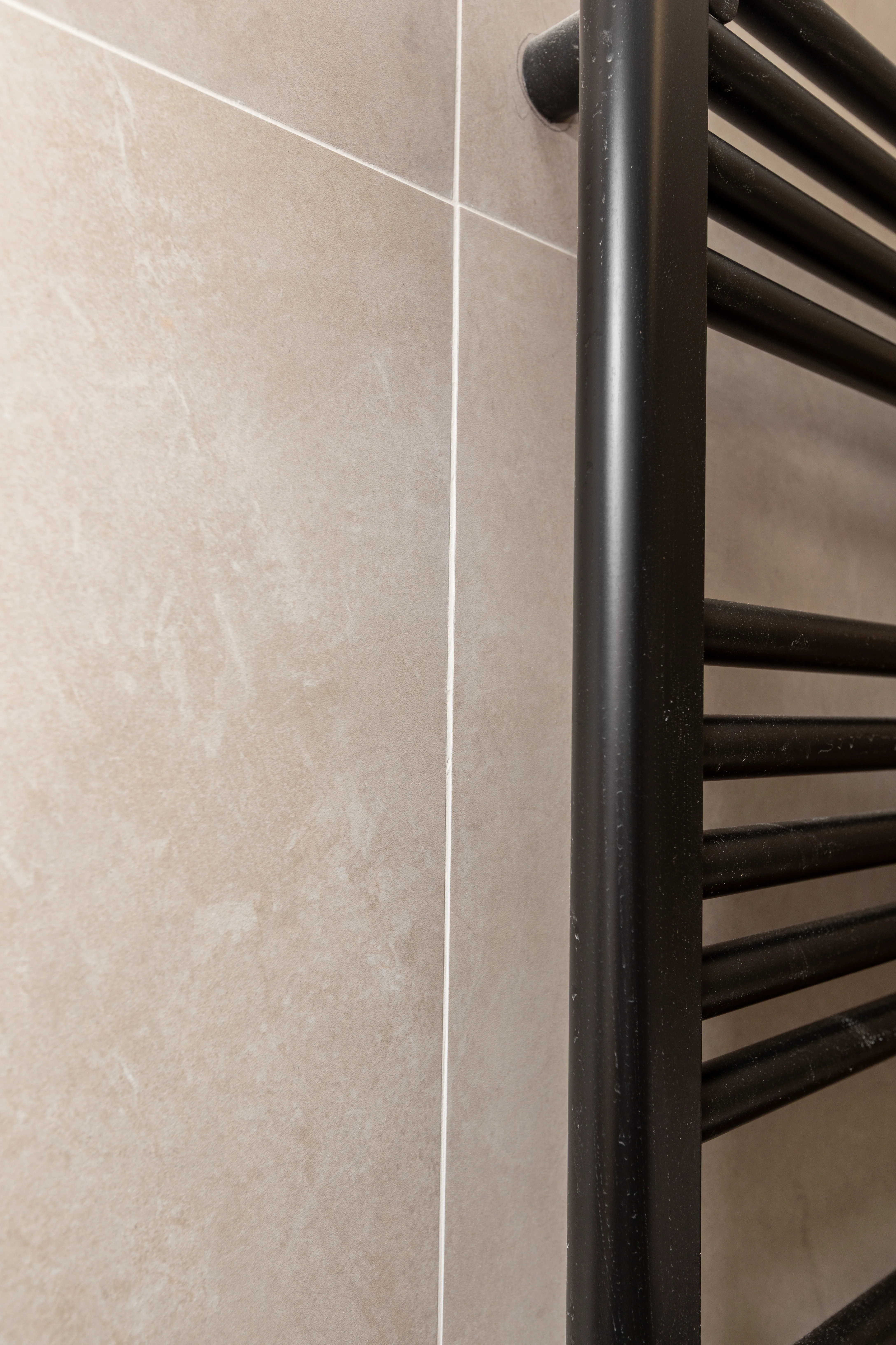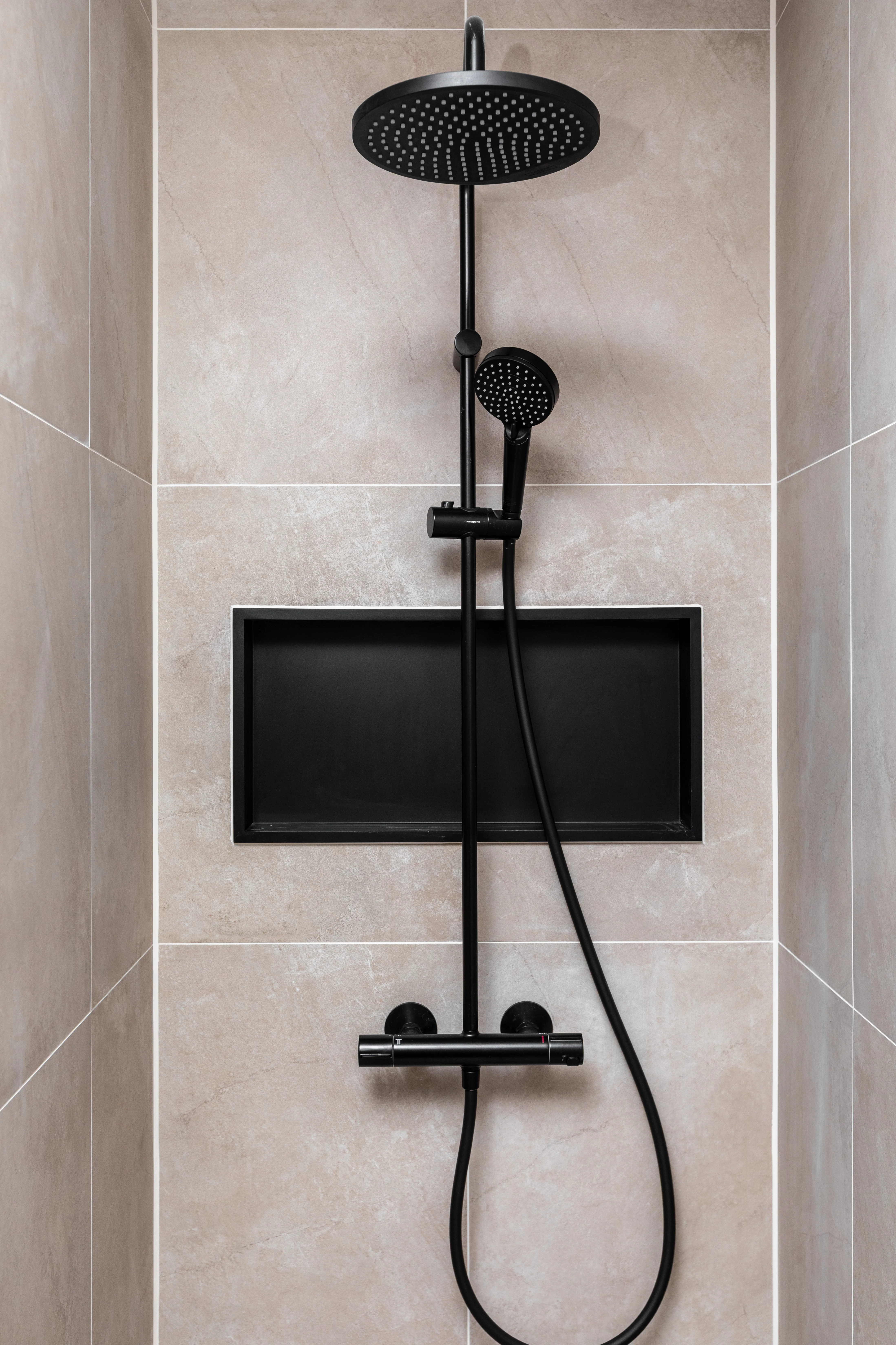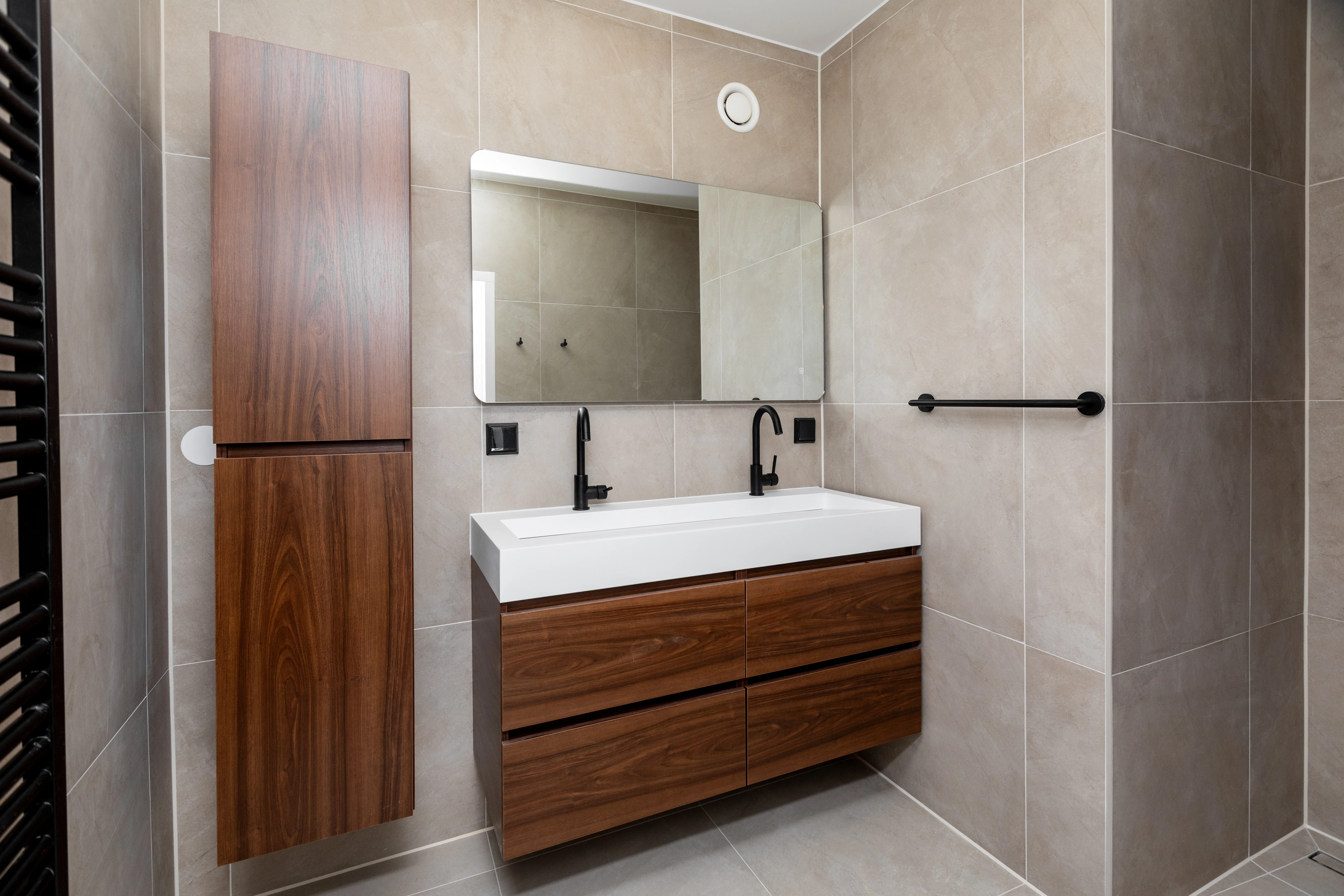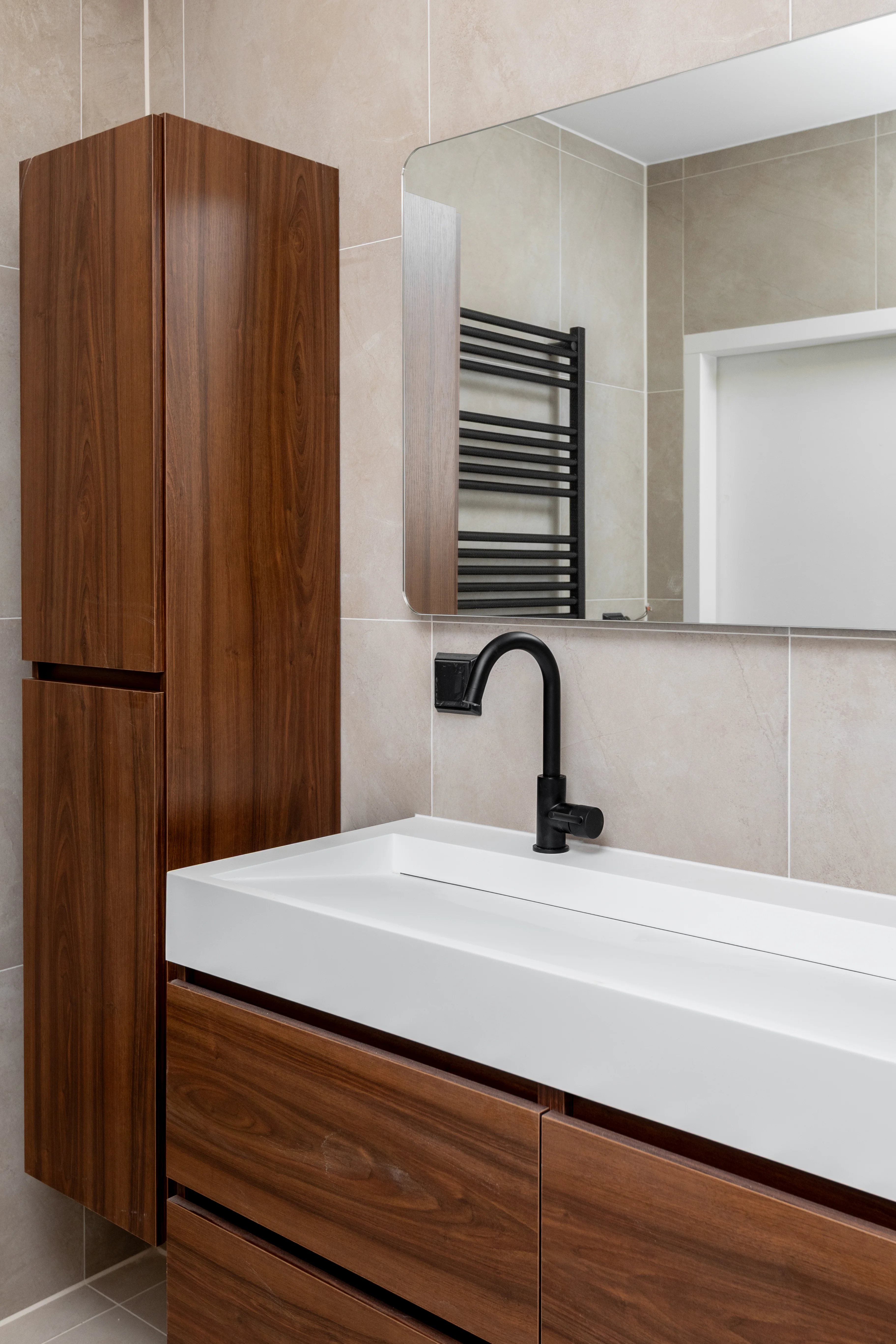 In this Amsterdam apartment, we transformed the bathroom into a calm, functional space with a spacious rain shower and a 120 cm double washbasin. A waterproof structure, precise tiling, and softened acoustics make daily use comfortable and low-maintenance.