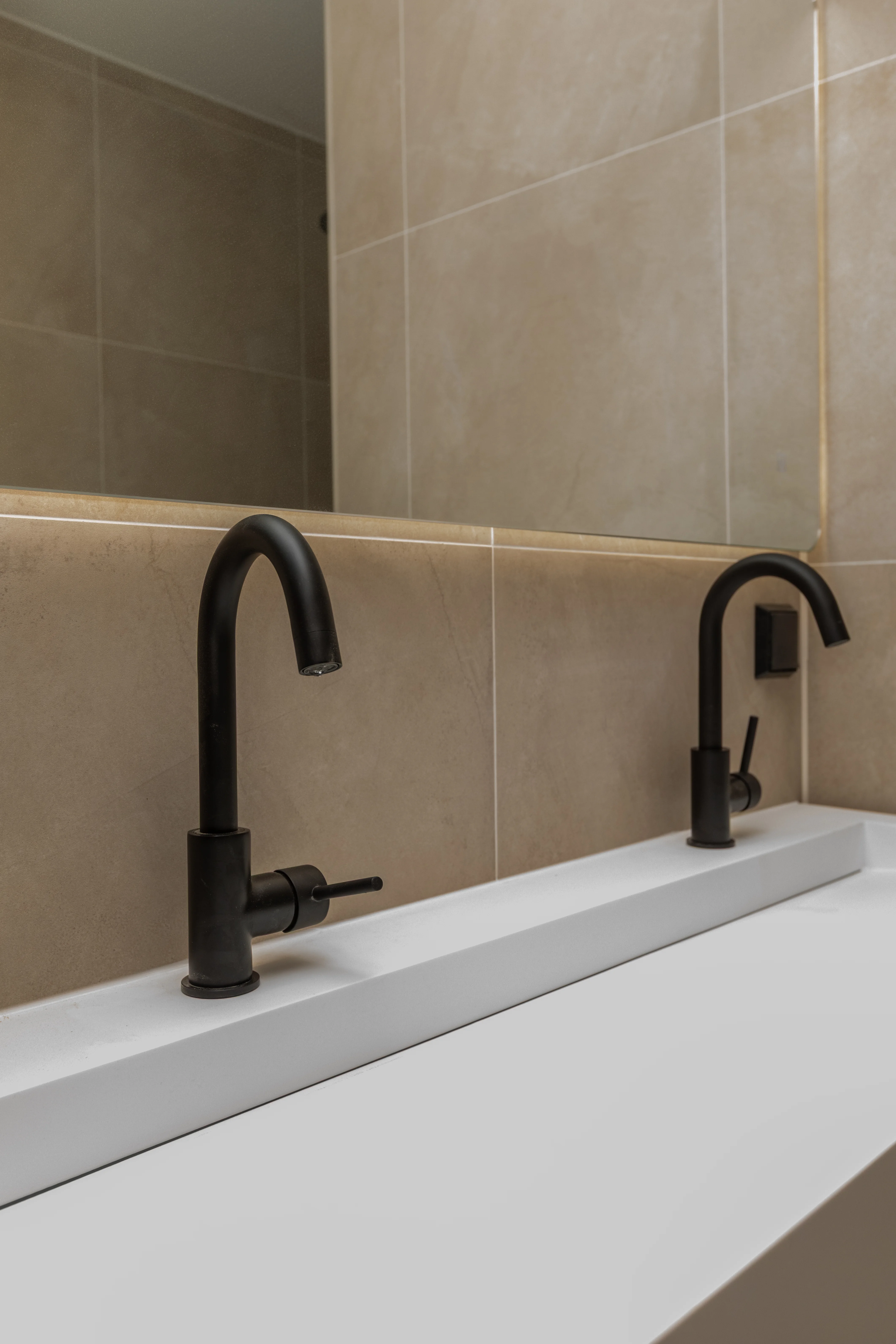 After checking watertightness, sealant seams and flow, the bathroom was delivered clean. The result: a clear, spacious bathroom setting with quiet acoustics, a rain shower as a daily ritual, and a double sink that effortlessly captures the morning rush — sleek, timeless and ready for intensive use.